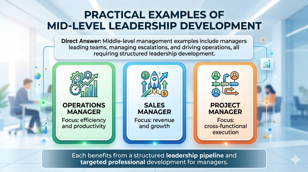 Middle-level management examples such as managers handling the cross-functional teams, manging the client escalations, and foster operational improvements, all of them require structured leadership development.